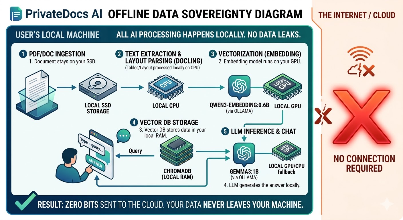 This is why we built PrivateDocsAI. It isn't just another "wrapper" for a cloud API. It is a completely offline enterprise AI that brings the model to your data, rather than the other way around.
