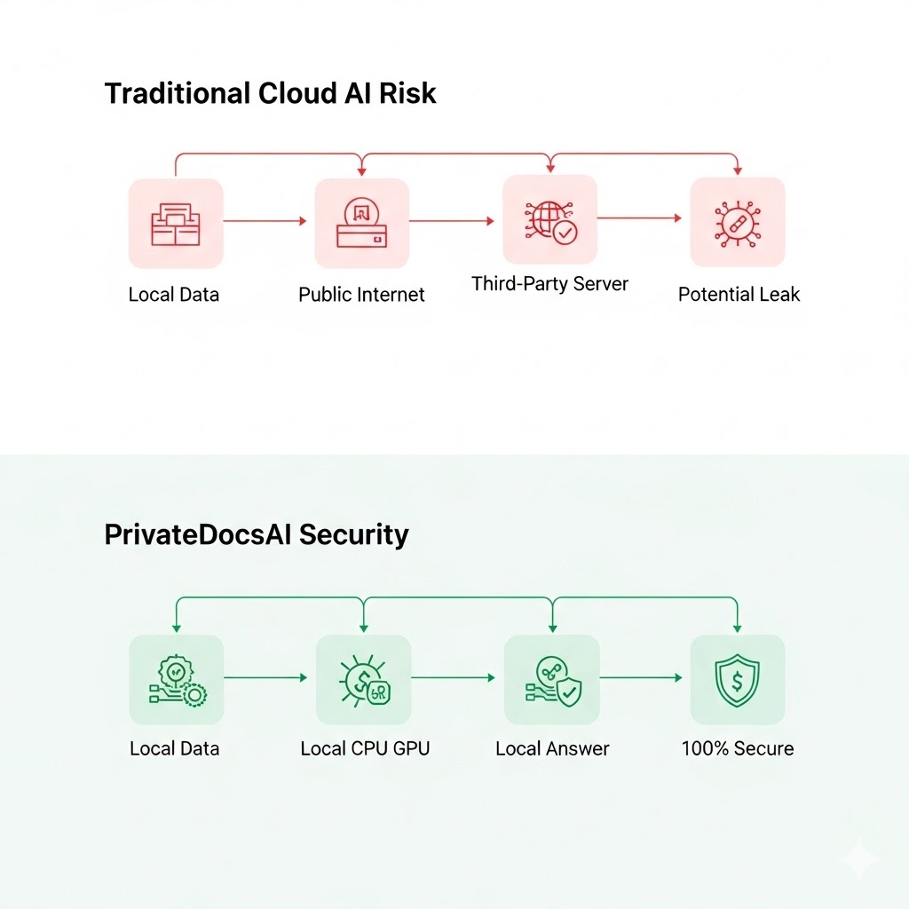 PrivateDocsAI uses a Private RAG (Retrieval-Augmented Generation) architecture. Here is how it works on your local machine: